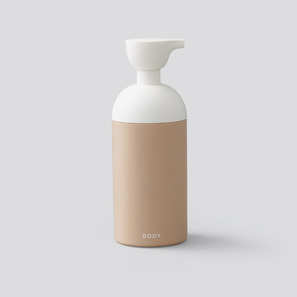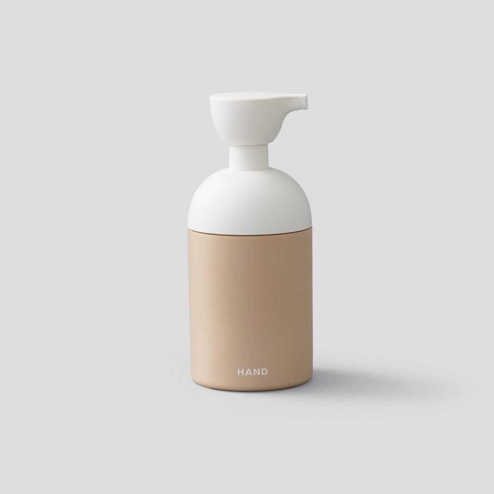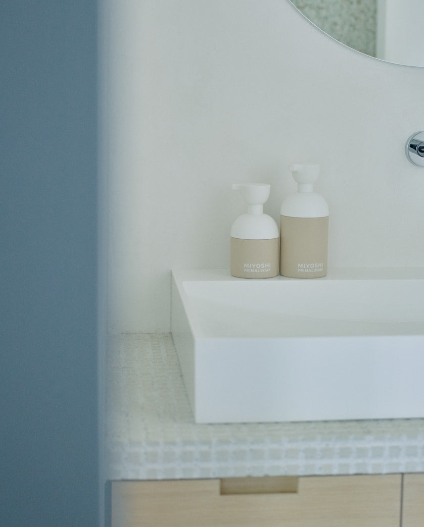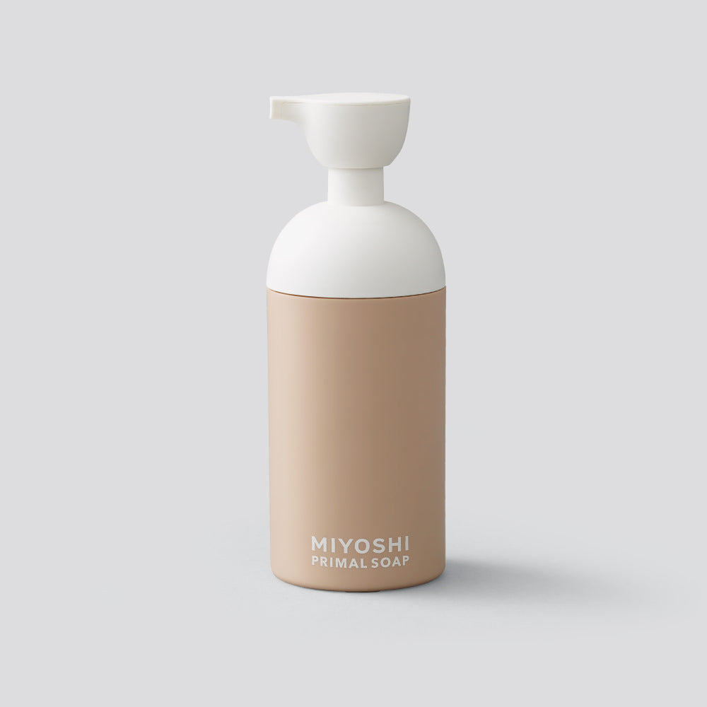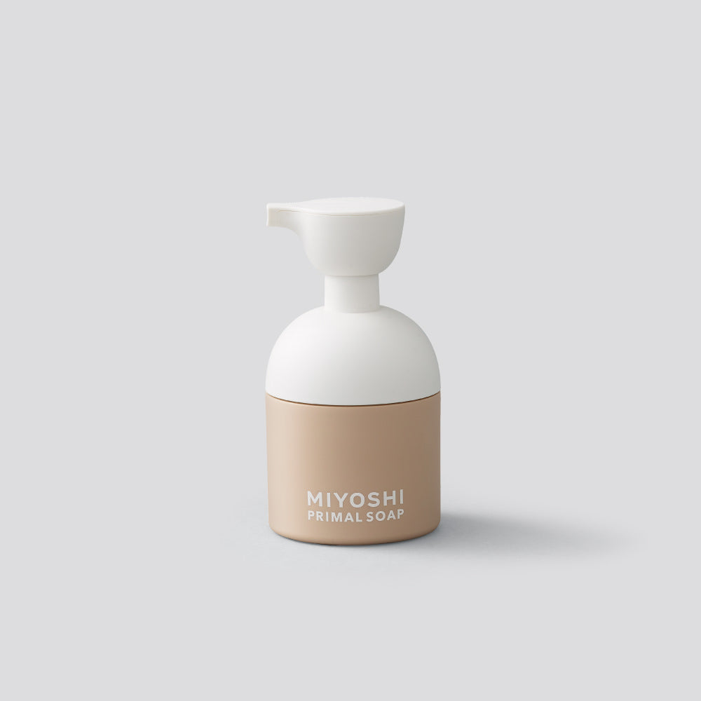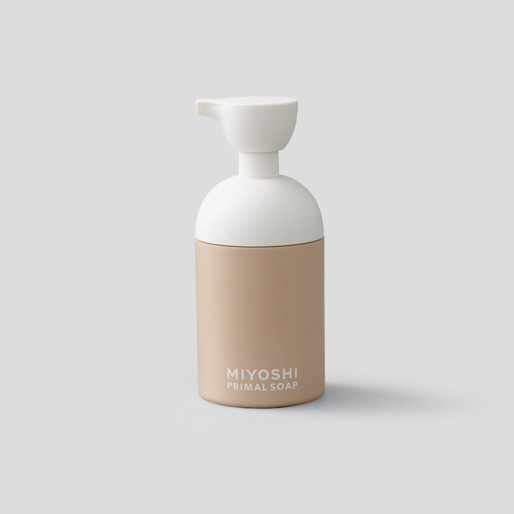 美しさと使いやすさは、日常を支える両輪です。「MIYOSHI PRIMAL SOAP」のボトルデザインを手がけたのは、日本を代表するプロダクトデザイナー・柴田文江氏。アイコニックなノズルのかたち、有機的な曲線がつくる優しい佇まい。置く場所を選ばず、どんな空間にも自然に溶け込みながら、使うたびにふと目を奪われる、静かな存在感。ベージュと白の2トーンカラーが、日々の暮らしにそっと寄り添います。